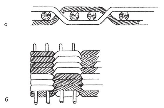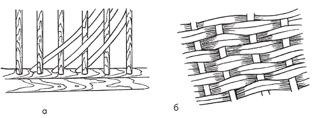 Рис. 6. Косое плетение: а – начальный этап; б – готовое плетение