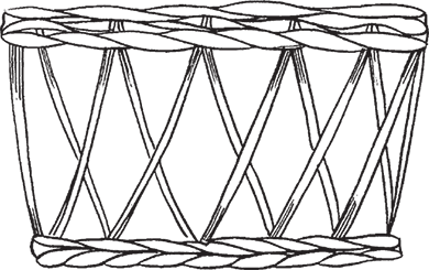 Для данного способа плетения берутся нечетное количество стоячков и длинные прутья. Последние должны быть достаточно длинными, чтобы каждый ряд выплетался одним прутом. Закрепите один прут с внутренней стороны, обогните им стоячок и выведите в соседнее отверстие. Потом закрепите и протяните 2-й прут. При этом его нужно направлять под внешний виток 1-го прута. Затем обогните следующий стоячок над 1-м прутом (рис. 3). Вы также можете сделать веревочку в три прута (рис. 4).