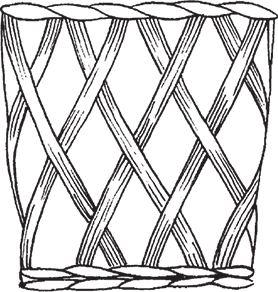 Характерная особенность данного способа плетения заключается в том, что перед тем как начинать его, необходимо сплести веревочку. Очередной ряд также выполняется веревочкой, но в противоположном направлении (рис. 5). Более сложным считается косое плетение, показанное на рис. 5.