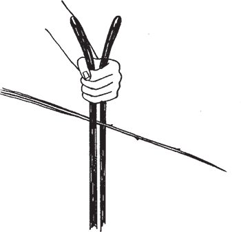 Для очищения ивовых прутьев от коры применяется специальный инструмент – щемилка. Подготовленные прутья следует положить справа от себя и по очереди пропускать через отверстие этого устройства (рис. 20). Профессионалы умеют очищать с помощью щемилки несколько прутьев одновременно.
