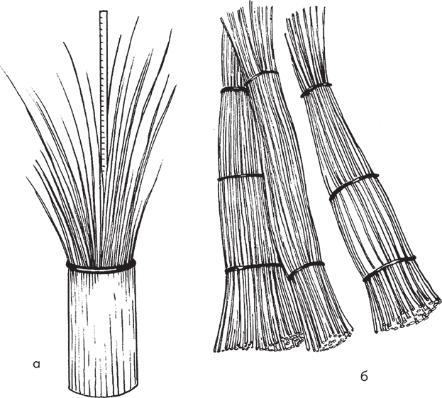 Рис. 23. Сортировка ивовых прутьев: а – подготовка прутьев; б – пучки прутьев, рассортированных по размеру
