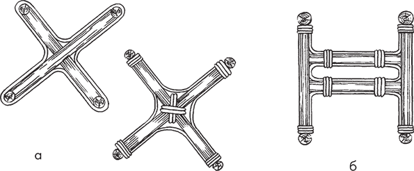 Чтобы придать плетеной мебели дополнительную устойчивость, используются проножки. Их детали скрепляются гвоздями и обвиваются ивовой лентой. Проножки должны быть расположены на высоте 120 мм от уровня пола. Они могут быть крестообразными и двутавровыми (рис. 15).