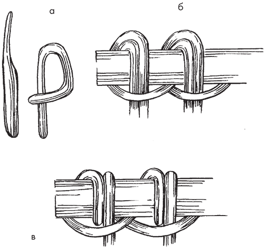 Рис. 1. Плетенка в один прут: а – общий вид; б – схема выполнения; в – закрепление нового прута с обратной стороны стойки; г – присоединение нового прута
