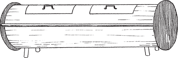 Такой котел можно заменить электрическим (рис. 18) или снабдить газовой горелкой. Чтобы соорудить первый, вам потребуется труба длиной 2,4 м и диаметром 30 см. Ее боковые отверстия нужно закрыть, приварив к ним листы стали, а в получившемся котле сделать два проема. К краю каждого из них прикрепите петли и повесьте на них специальные дверки с ручками. К нижней стороне котла следует приварить ножки, а на торцевых сторонах выполнить по два отверстия (для тэнов). С лицевой и обратной стороны в местах крепления тэнов сделайте прокладки из резины.