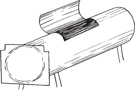 Выполните пропилы, направляя ножовку от нанесенной по окружности линии к середине торцевой стороны заготовки (рис. 28). Спилите клиновидные сегменты, ведя инструмент от соседних разметочных линий (рис. 29, а), и удалите те, что находятся с торцевых сторон каждой части детали (рис. 29, б). Выровняйте поверхность спилов стамеской (рис. 30), а затем обработайте ее, используя теплую олифу или масло (рис. 31).