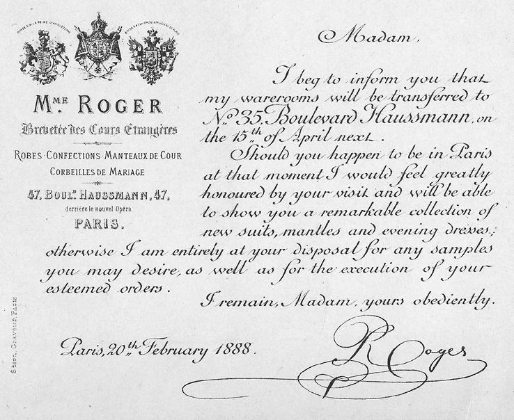 Ил. 1.1. Рекламная карточка для англоговорящих клиентов кутюрье мадам Роже, ателье на Бульваре Осман, 47. 1888 год. Репродукция любезно предоставлена Librairie Diktats