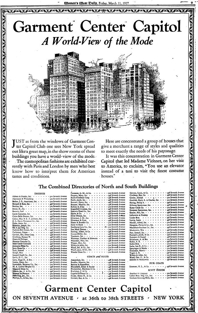 Ил. 1.5. Реклама Гармент-Центр-Капитол, объекта недвижимости, в который инвестировали многие предприниматели в области моды, в том числе Морис Рентнер. Women's Wear Daily, 11 марта 1927 года, с. 9 © Fairchild Publishing LLC