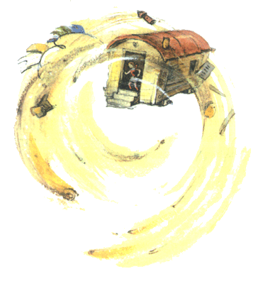 Домик повернулся два или три раза, как карусель. Он оказался в самой середине урагана. Вихрь закружил его, поднял вверх и понес по воздуху.