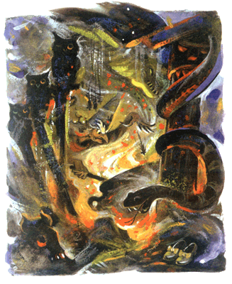 В большом закопченном котле Гингема варила волшебное зелье. Она бросала в котел мышей, отрывая одну за другой от связки.