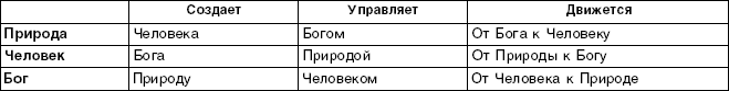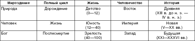 Третий столбец вроде бы никаких Америк не открывает – обыкновенное деление жизни на три главных периода. До 12 лет человеческая жизнь вполне природная, от 12 до 40 собственно человеческая, а после 40 лет человек стремится к развитию в себе божественного. Однако не будем забывать, что именно из этого разделения на три части вышло учение о тройственности мироздания. Только после доказательства, что в начале каждого из трех периодов человек ставит перед собой новую цель, а в конце ее решает, удалось подтвердить тройственную структуру человека (природа – разум – душа).