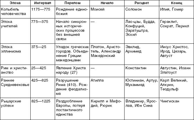 Четвертый столбец этой таблицы может показаться неожиданным, ибо речь в нем идет об историческом процессе, о трех видах исторического ритма, о человечестве, детство которого проходит в ритме Востока (глобальный Восток), юность приходится на период имперских преобразований (48 веков, 12 до нашей эры и 36 после), а в старости человечество будет пребывать в глобальном Западе.