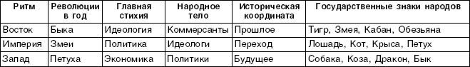 Затем появились первые Империи. Революции в этом ритме совершались в годы Змеи. Сквозное шествие по времени стало невозможным, только один 144-летний цикл, а далее возврат в ритм Востока или скачок в ритм Запада. Но главное конечно же в том, что сила Империй была в их политике, всегда новаторской, всегда оригинальной. Именно благодаря прорывному имперскому новаторству мир стал преображаться, прогрессировать, двигаться от одной модели власти к другой. Народное чудо (четвертая фаза) находилось в сфере идеологии и немало обогатило сокровищницу мировой культуры. А самое уникальное состоит именно в том, что постепенно через имперские преобразования стал зарождаться мир Запада. Непосредственно из мира Востока государство с западным ритмом родиться не может.