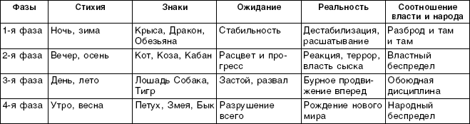 Ну и конечно же крайняя правая колонка. Она чрезвычайно важна для понимания современного момента и прогноза на ближайшие дни. Первая фаза именно потому и расшатывает государственное устройство, что оба участника процесса, народ и власть, крайне безответственны и лишены государственной энергии. Во второй фазе государственная идея овладевает народом, он обретает дисциплину, власть же превращается в шайку бандитов. В третьей фазе при сохранении народной дисциплины власть также берет себя в руки, сохранив этот настрой и на четвертую фазу. Народ же в четвертой фазе распоясывается совершенно, что, с одной стороны, приводит к так называемым народным чудесам (идеологическое чудо в Империи, политическое чудо на Западе, экономическое чудо на Востоке), а с другой стороны, поднимает тягу народа к восстаниям, бунтам, преступности.