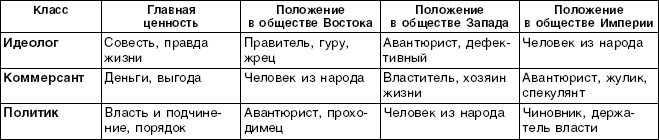 Труднее понять, каково положение изгоев общества. В Империи коммерсантов народная молва всегда делает кровопийцами, спекулянтами и жуликами. Но верно и обратное – именно в коммерцию идут люди авантюрного, безнравственного склада. На Западе истинный идеолог – это всегда фанатик, человек не от мира сего, изобретатель какой-нибудь гадости, носитель какой-либо нелепой идеи. Почему непременно нелепой? Да потому, что все нормальные идеи разобраны политиками и коммерсантами. На Востоке самая парадоксальная ситуация: авантюристы – это те, кто, не имея никаких идеологических мотивов, ни с того ни с сего начинают бороться за власть. В восточном обществе такое может прийти в голову только откровенному бандиту.