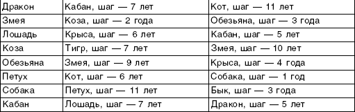 Принцип построения таблицы понять очень просто. Пять из двенадцати взаимно волшебных годов или дней есть у двоих людей одного и того же знака. По четыре таких волшебных острова имеют участники векторных пар. По три волшебных острова у тех, кто имеет одного общего векторного соседа. По два взаимно волшебных года у тех, кто в векторной цепи имеет два знака в промежутке. Наконец, один волшебный остров дан тем знакам, которые в векторной цепи отстают друг от друга на счет «четыре». Остаются еще три знака, с которыми совместное волшебство невозможно в принципе. Значит ли это, что те, кто к этим знакам принадлежат, не могут полюбить друг друга? Нет! Просто пожар в их душах будет возгораться по очереди. Такой сложной любви не позавидуешь.