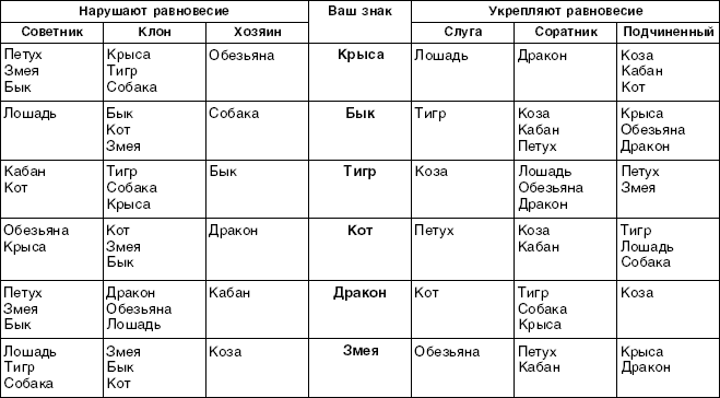 Читать таблицу надо с центра, в четвертом столбце расположен знак, для которого и составлено все окружение. Слева располагаются три столбца со знаками, ослабляющими равновесие, справа три столбца со знаками, укрепляющими равновесие. Впрочем, у персонажа каждого столбца своя специфика.