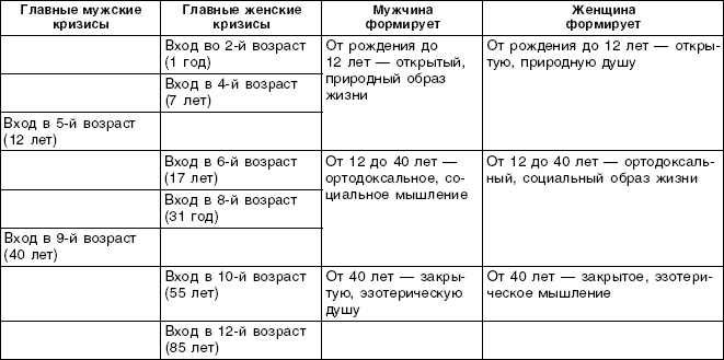 16. Обращаясь к женским вопросам, в первую очередь неизбежно сталкиваемся с так называемой загадкой женщины. Кто она – женщина, чем отличается от мужчины и почему так часто и так настойчиво утверждают мыслители, что женщина и не человек вовсе? Главная разгадка обнаруживается на территории возрастного продвижения. В одних и тех же возрастах мы, оказывается, формируем совершенно разные вещи (таблица 16).