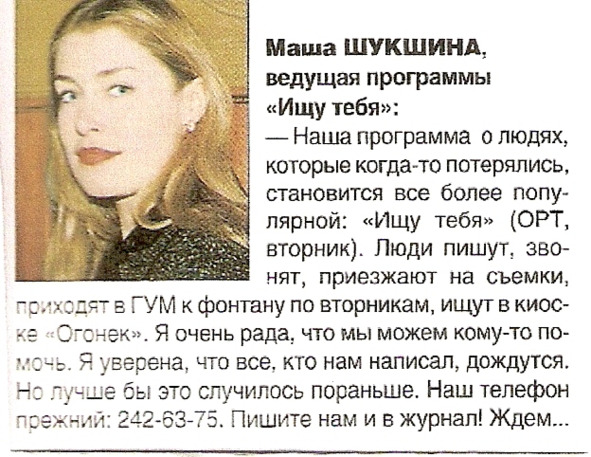 Прошу Вас, пожалуйста, помочь в поиске моей матери, если это возможно. С глубоким уважением к Вам. 28.10.1999 г. Подпись».