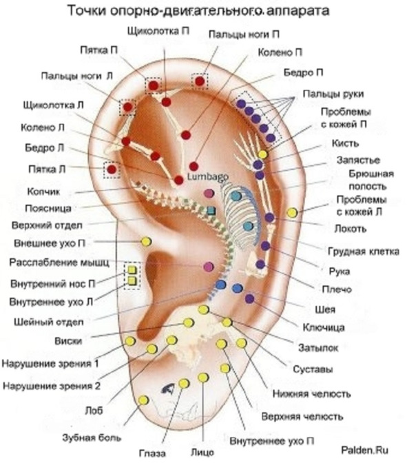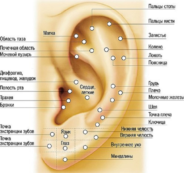 На ушных раковинах имеются активные точки, связанные с внутренними органами.