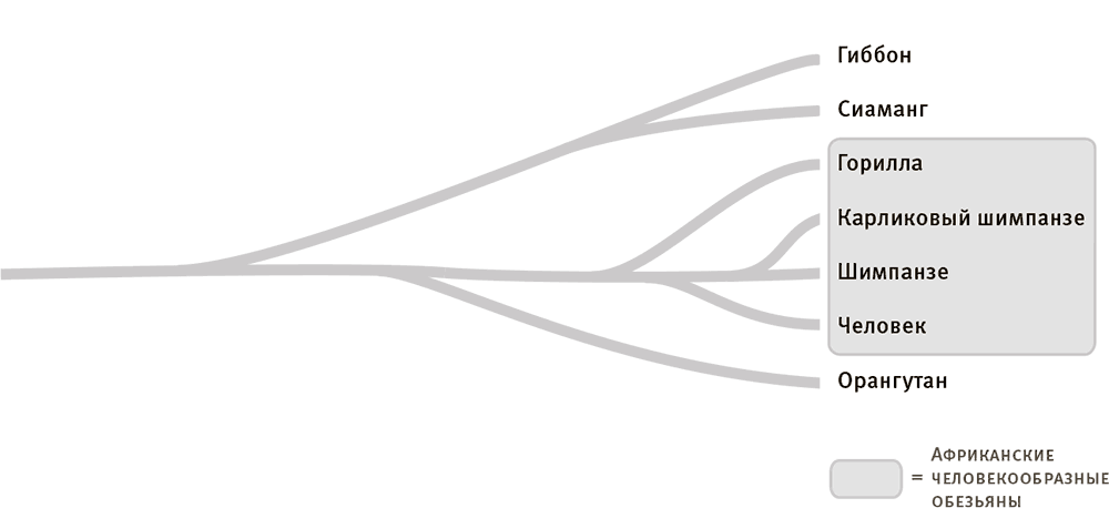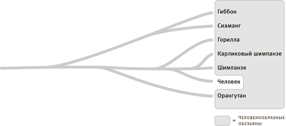 Термином “человекообразные обезьяны” (apes) обычно называют шимпанзе, горилл, орангутанов, гиббонов и сиамангов. Мы признаем, что похожи на человекообразных обезьян, но редко осознаем, что мы тоже человекообразные обезьяны. Наши общие предки с шимпанзе и гориллами жили намного позже, чем их общие предки с азиатскими человекообразными – гиббонами и орангутанами. Не существует такой естественной группы, которая включала бы шимпанзе, горилл и орангутанов, но не включала бы людей. Искусственность понятия “человекообразные обезьяны” в его обычном смысле, исключающем людей, видна из следующей диаграммы. На генеалогическом древе человекообразных обезьян люди находятся в самой гуще ветвей. Закрашенная область показывает искусственность традиционного понимания “человекообразных обезьян”.