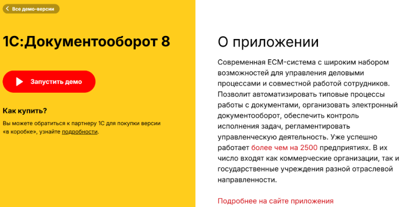 Как сказано на сайте фирмы 1С (рис. 1), программный продукт «1С:Документооборот» – это «современная ECM-система с широким набором возможностей для управления деловыми процессами и совместной работой сотрудников. Позволит автоматизировать типовые процессы работы с документами, организовать электронный документооборот, обеспечить контроль исполнения задач, регламентировать управленческую деятельность. Уже успешно работает более чем на 2 500 предприятиях. В их число входят как коммерческие организации, так и государственные учреждения разной отраслевой направленности» [15].