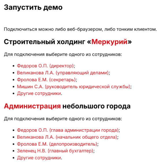 Рис. 5. Страница для запуска демонстрационных конфигураций «1С:Документооборота 8»