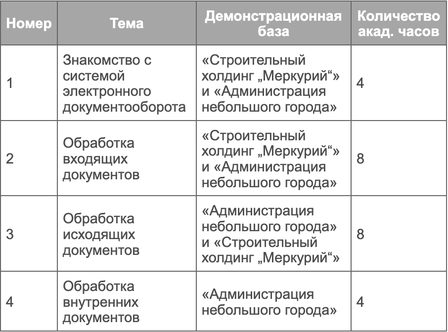 Проведенный автором анализ практики использования систем электронного документооборота в учебном процессе вузов Российской Федерации [19] показал, что образовательные организации понимают всю важность возложенных на них задач и включают процесс изучения данных систем в курсы таких дисциплин, как: