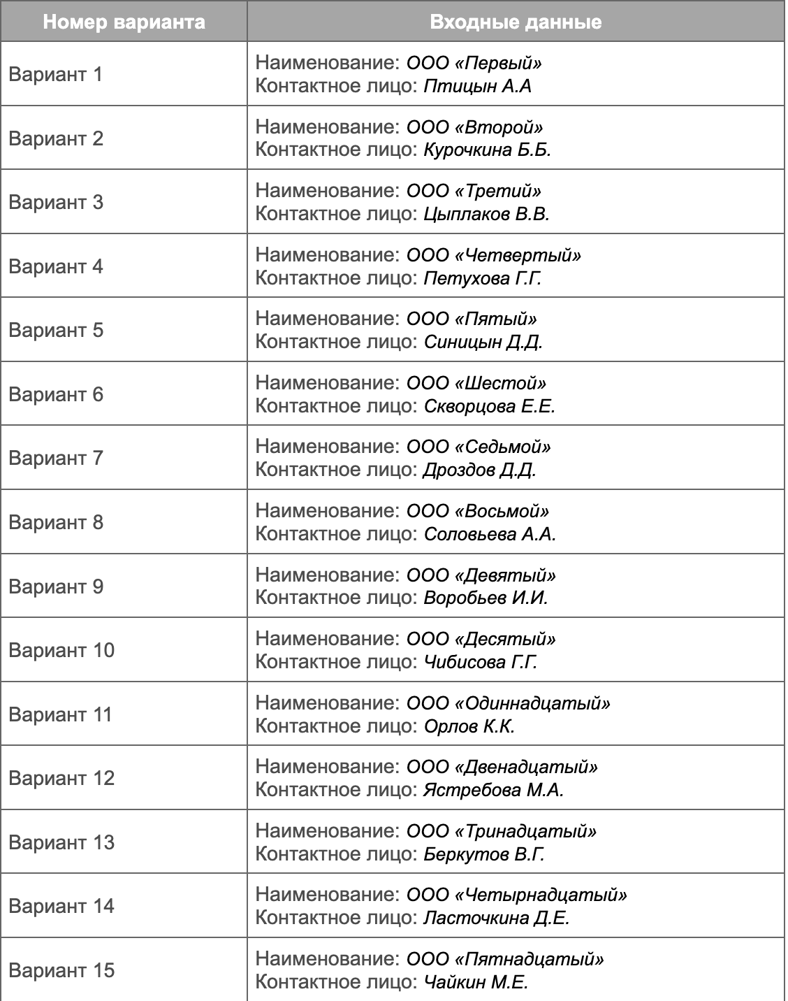 - Внесите в информационную базу демонстрационной конфигурации программного продукта «1С:Документооборот 8» версии 3.0 «Администрация небольшого города» информацию о контрагенте по номеру варианта (табл. 2), соответствующего вашему номеру в списке журнала учебной группы. Повторите внесение этого же контрагента в демонстрационной конфигурации для версии 2.1. Сравните результаты.