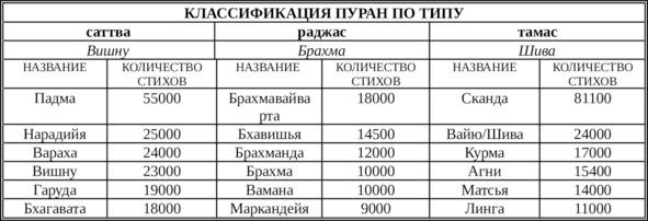 В Падма Пуране тексты пуран сгруппированы и разделены на три части соответственно трем основным качествам существования: благость (саттва), раджас (страсть) и невежество (тамас). Матсья Пурана (190.13—14. гласит, что саттвические пураны связаны с восхвалением Вишну, раджастичные — с восхвалением Брахмы, а тамасичные — с восхвалением Шивы (или Агни). «Падма Пурана» (Уттара кханда 236.18—21) классифицирует пураны следующим образом: