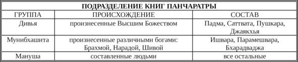 Выделяют три главных агамические школы: Шайва, Шакта и Вайшнава, каждая из них имеет свои собственные панчаратры. Среди вайшнавов последователи Шри-сампрадайи (Шри вайшнавы) берут многое от агам. Все эти агамы концентрируются вокруг четырех основных тем: