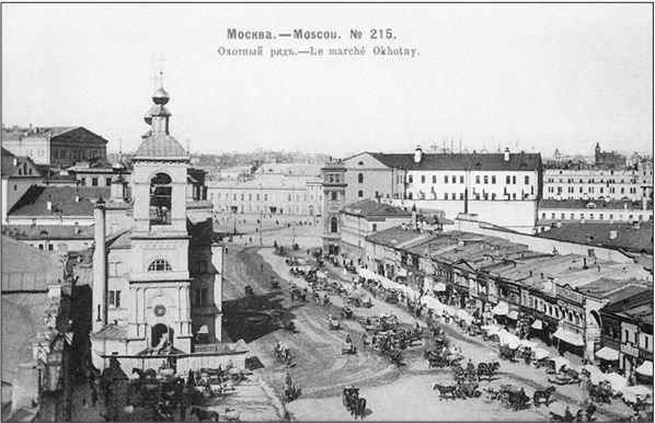 Тот Охотный ряд, по которому бродил с руками в карманах и открыв рот иноземец, находился в те времена несколько поодаль от нынешней коротенькой одноименной улицы (всего 250 метров!) – на месте современного Исторического музея. Границы Охотного ряда были очерчены с одной стороны рекой Неглинкой, протекавшей через всю Театральную площадь и далее к Москва-реке, а с другой стороны, Китайгородской стеной. В 1737 году Охотный ряд сгорел, и новое торжище перенесли поближе к устью Тверской улицы, на Манежную площадь, откуда оно и стало наступать своими лавками да лабазами туда, где нынче стоит гостиница «Москва». Согласно данным 1745 года, в трех линиях Охотного ряда стояло более двух десятков деревянных лавок.