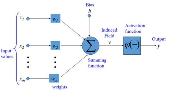 Artificial neuron is a mathematical function conceived as a model of biological neurons, a neural network. The difference between an artificial neuron and a biological neuron is shown in the figure. Artificial neurons are the elementary units of an artificial neural network. An artificial neuron receives one or more inputs (representing excitatory postsynaptic potentials and inhibitory postsynaptic potentials on nerve dendrites) and sums them to produce an output signal (or activation, representing the action potential of the neuron that is transmitted down its axon). Typically, each input is weighted separately, and the sum is passed through a non-linear function known as an activation function or transfer function. Transfer functions are usually sigmoid, but they can also take the form of other non-linear functions, piecewise linear functions, or step functions. They are also often monotonically increasing, continuous, differentiable, and bounded[92],[93].