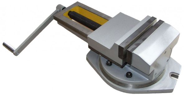 Перед вами тиски машинные. Они очень надёжные. В низу вы видите фланец для крепления с двумя проушинами. Так же вы видите блестящий поясок с градуировкой. Открутив четыре гайки вы развернёте тиски на любой градус. Это очень удобно для обработки изделия фрезой. Достаточно один раз закрепить деталь в тисках. Потом вертите как хотите тисками для фрезеровки изделия под нужными градусами. Очень удобно я вам скажу. Слесарные тиски будут очень не удобны. Вот такого варианта тиски используются для работы на всех разновидностях станков. Станочных тисков разных моделей и размеров очень много. Вот один из сайтов об этом.