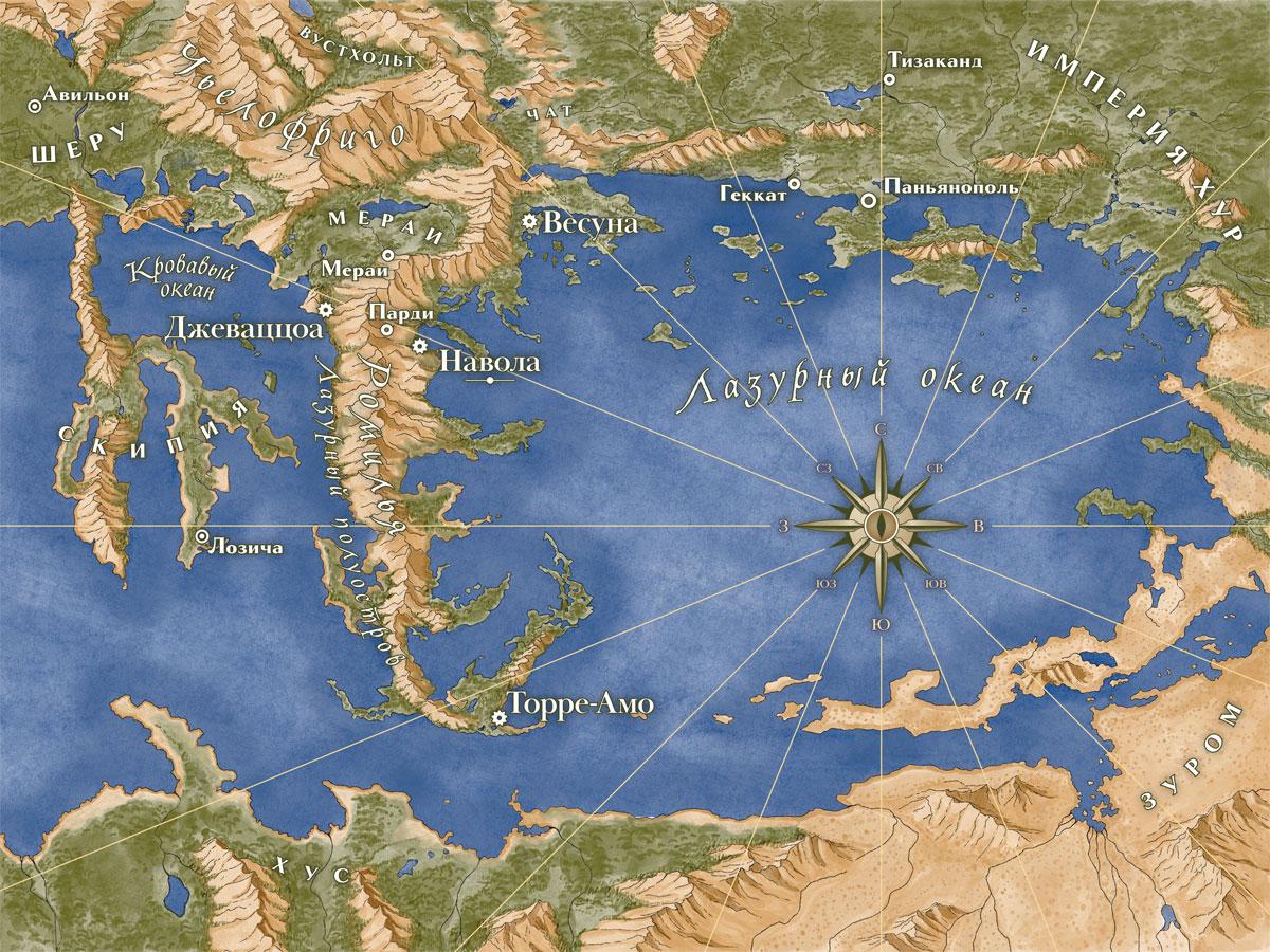 В чем можно было удостовериться, так это в том, что глаз обнаружили в гробнице могущественного правителя — не уточняя, было ли это научным открытием или откровенным грабежом, — но в любом случае цепочка событий доставила находку в караван торговца, который проследовал по торговым путям через ледяные перевалы Хим и Харат, по белопенным волнам Лазурного океана в наш прекрасный город Наволу, бьющееся сердце банка мерканта [1] всех земель, что говорили на амонских диалектах, и наконец глаз попал к моему отцу, Девоначи ди Регулаи, который славился своим богатством и влиянием на побережье Лазури.