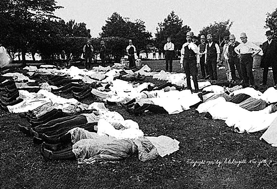 События романа Улисс происходят 16 июня 1904 года. Сегодня эта дата отмечается как «Блумсдэй», день, посвященный Леопольду Блуму, главному герою книги. Но в то время, когда Джеймс Джойс работал над своим модернистским шедевром, этот день имел совершенно иные коннотации, подобные тем, которые могла бы вызвать сегодня дата 12 сентября 2001 года. Джойс знал, что он помещает события своего повествования в день, следующий за тем, когда газеты всего мира сообщили на первых полосах об этом «ужасном происшествии», в котором «все эти женщины и дети сгорели и потонули в Нью-Йорке во время морской прогулки. Гекатомба» [29]. Пятнадцатого июня пароход «Генерал Слокам», перевозивший на пикник членов общины Евангелическо-лютеранской церкви Святого Марка из «Маленькой Германии» Нижнего Ист-Сайда, загорелся и затонул на мелководье недалеко от берега Бронкса. Более тысячи из тысячи трехсот пассажиров погибли. Большинство из них были женщины и дети. До конца XX века это событие оставалось самой страшной трагедией в истории Нью-Йорка. В отличие от пожара на фабрике «Трайангл» и катастрофы «Титаника» несколько лет спустя, трагедия «Генерала Слокама» оказалась практически стерта из памяти города. И тем не менее нет ничего более показательного, чем событие, которое следует запомнить, но которое оказывается забыто. На дне коробки с рукописью Манхэттенского проекта я нашел эту фотографию жертв трагедии, на которой их тела и лица накрыты белой тканью. Но самым жутким, почти невыносимым, мне кажутся взгляды стоящих мужчин, направленные прямо в объектив снимающей их камеры.