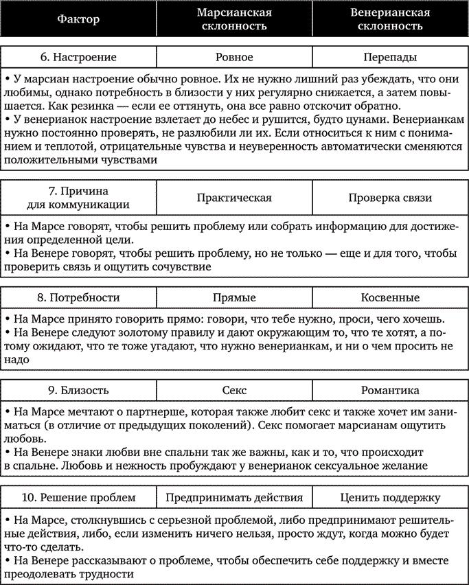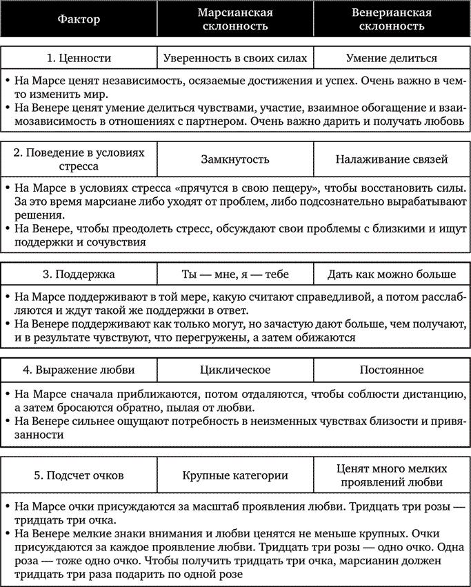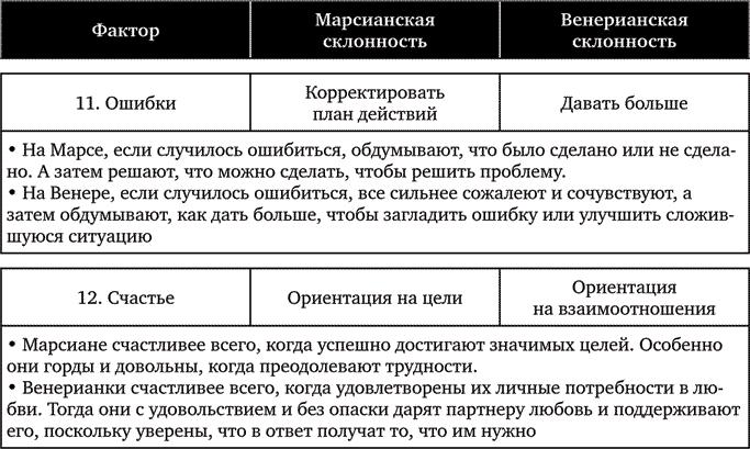 Ниже перечислены двенадцать основных факторов, чаще всего ведущих к недоразумениям между мужчинами и женщинами в относительно традиционных семейных отношениях. Однако в современном мире, более сложном, где женщины берут на себя традиционно мужские роли, они автоматически перенимают и многие марсианские склонности. И наоборот – поскольку мужчины понемногу начинают играть традиционно женские роли дома, у них появляются некоторые венерианские черты. Когда будете читать этот перечень, подумайте, какие черты больше свойственны лично вам. В чем вы и ваш партнер с Марса, а в чем с Венеры?