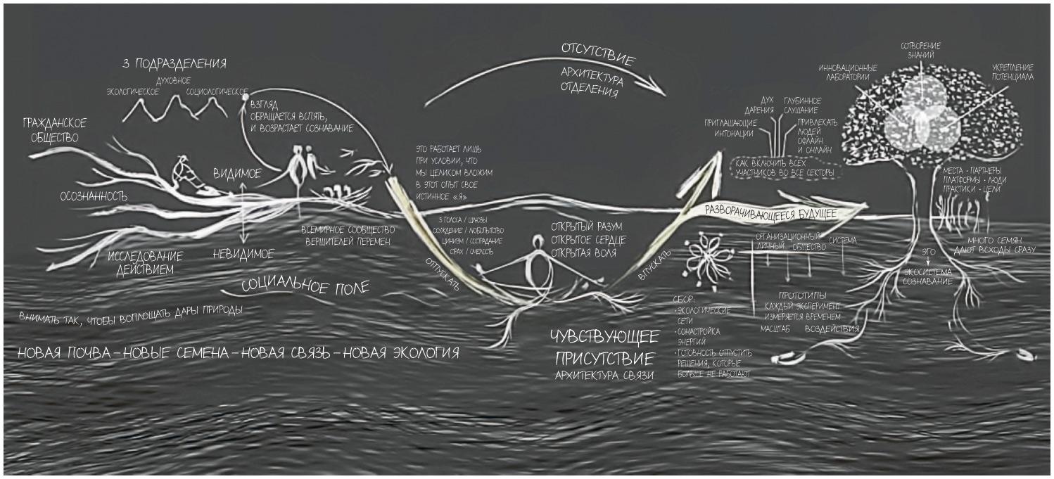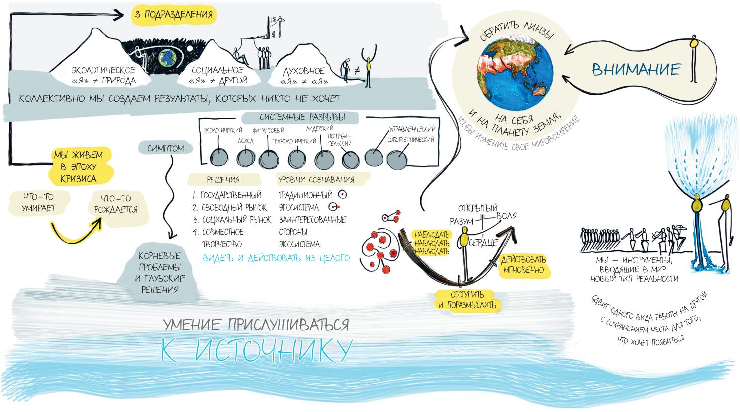 Человек, который долгое время был моим наставником, однажды сказал, что самое великое из всех человеческих изобретений — творческий процесс, посредством которого мы производим на свет новую реальность. Его понимание — основа подлинного мастерства в любой сфере. Это знание можно считать неотъемлемой частью искусства, и, хотя о нем говорят нечасто, оно определяет те моменты в театре, музыке, танце и спорте, когда «воздух напоен волшебством». Оно пропитывает то таинственное состояние, когда мы отдаемся чему-то высшему; когда, по словам Микеланджело, скульптор «высвобождает руку из сковывающего ее мрамора» или, по выражению Пикассо, «разум находит путь к кристаллизации своей мечты». Не менее важно творчество и в науке; как говорит экономист Брайан Артур, «все великие открытия приходят по глубокому внутреннему пути». Именно памятуя об этом, общем для всех, но при этом во многом эзотерическом знании, Отто Шармер считает, что ключом к решению многих кризисных вопросов нашего времени (а также будущего развития человечества) может стать обучение коллективному доступу к этому источнику мастерства.