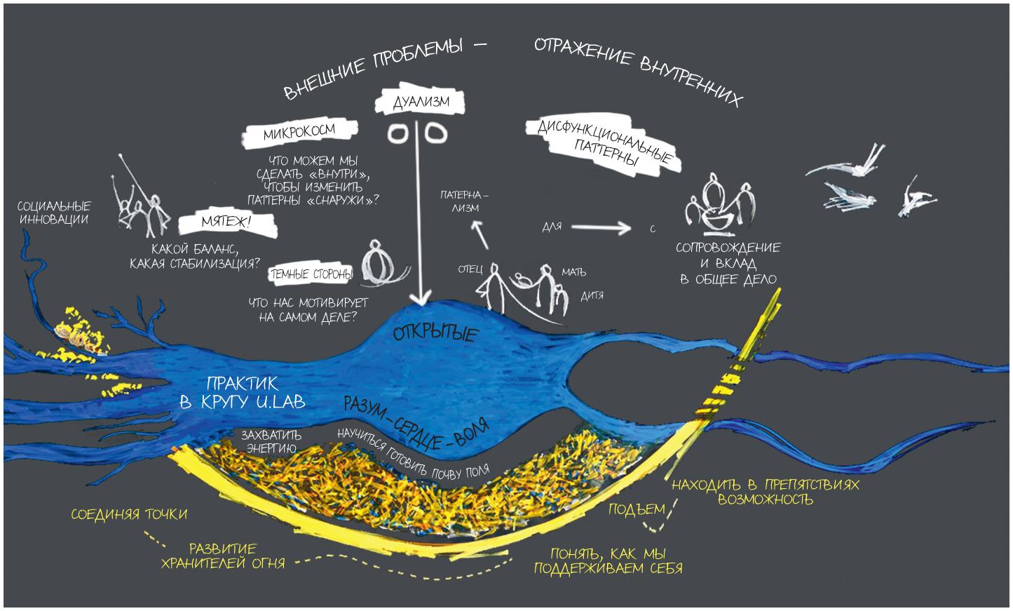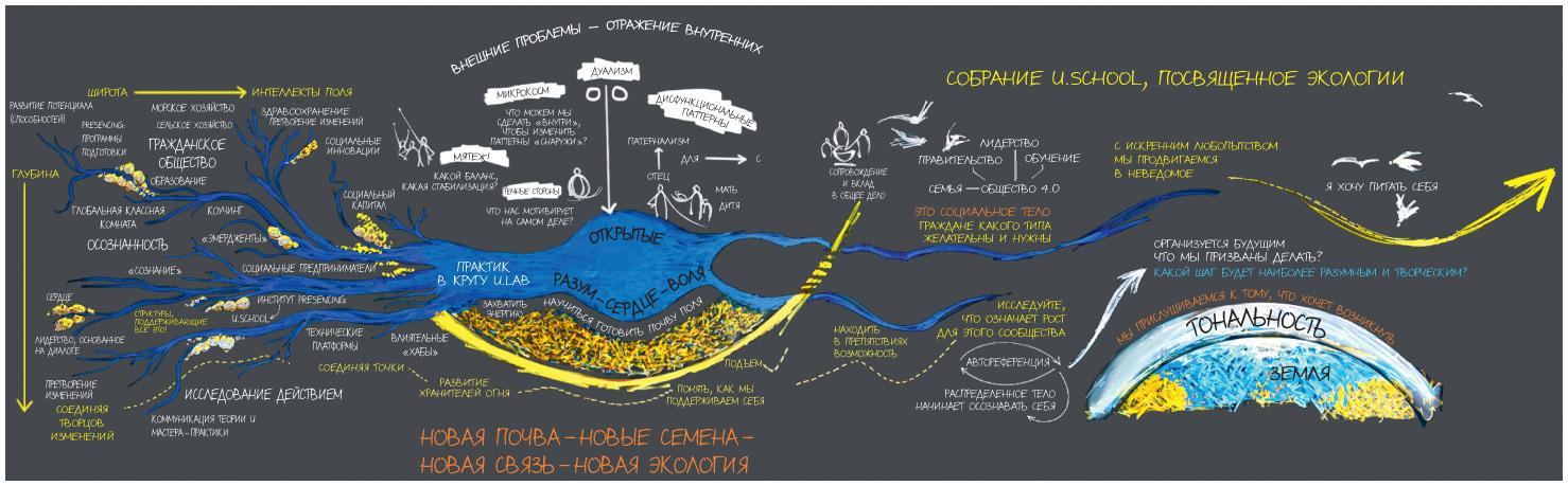 И последнее. Теория и методология U много говорят о природе лидерства, особенно во времена великих потрясений и системных сдвигов. Это лидерство приходит со всех уровней — не только «сверху», поскольку инновации касаются другого образа действия, а не просто разговоров о новых идеях. Оно возникает благодаря личностям и группам, которые способны отпустить устоявшиеся идеи, практики и даже собственную идентичность. Более же всего оно воплощается, когда люди соединяются с истинным «я» и нащупывают свою роль в создании и реализации по-настоящему важного будущего.