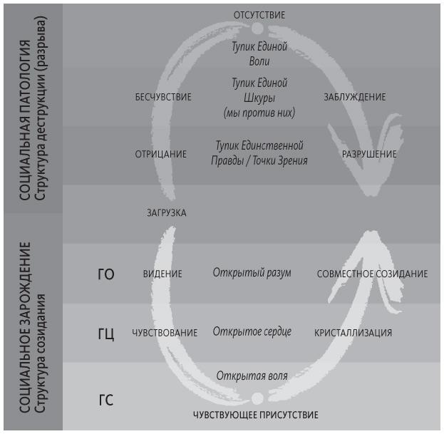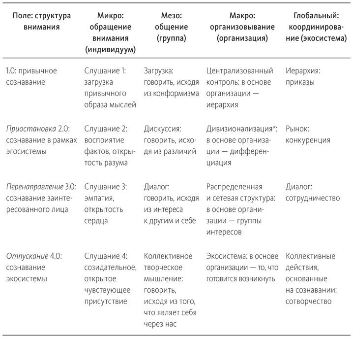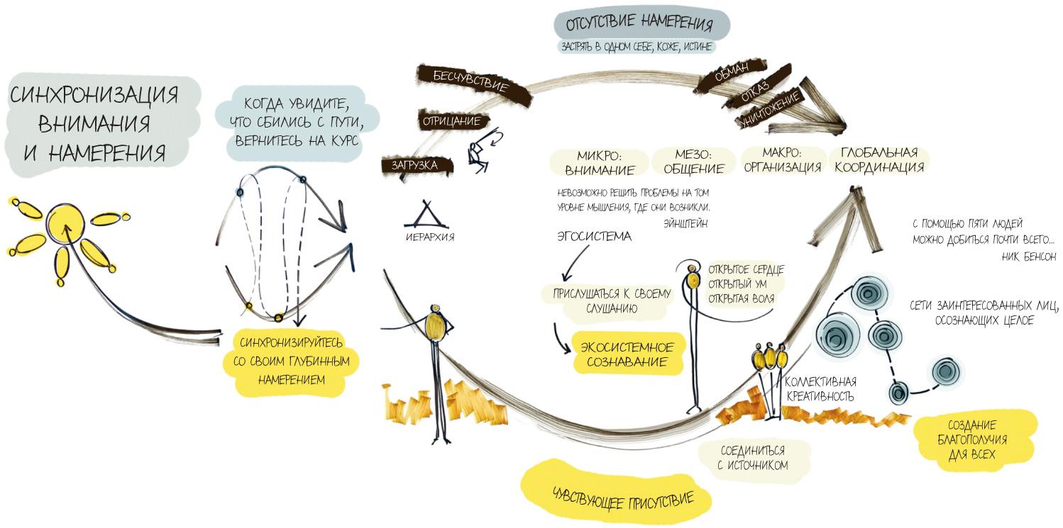 Интеграция теории и методологии предъявляет серьезные требования к читателю, и, без сомнения, в этом причина редкости подобных книг. Авторы такого рода хотят, чтобы мы были открыты как к серьезному интеллектуальному путешествию, так и к формированию собственного критического понимания, основанного на реальном испытании этих идей. Слишком много изданий продолжают «загружать» в нас непроверенные аксиомы и верования, даже параллельно озадачивая идеями. Вопрос всегда лежит в практической плоскости — в делах, а не только в мыслях. Считайте, что вас предупредили. Чтобы по-настоящему обогатиться знаниями благодаря этой книге о Теории U, нужно быть готовым предпринять собственное путешествие в переживание, чувствующее присутствие и осознание.