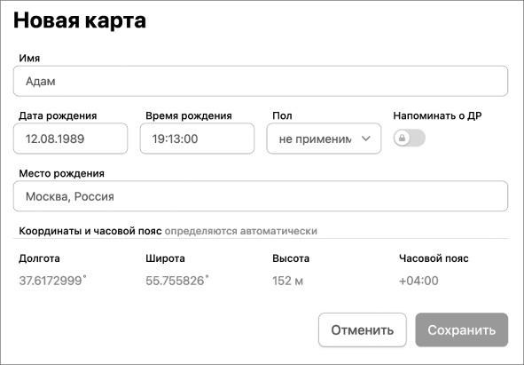 ●«Долгота», «Широта», «Высота», «Часовой пояс» — эти поля заполнять не нужно, сервис автоматически их проставит с учетом изменений часовых поясов, которые были на момент вашего рождения. Если сервис не проставляет их автоматически, возможно, вы неверно указали город (не выбрали из выпадающего списка) либо интернет-связь слабая. Во втором случае нужно подождать некоторое время, и данные отобразятся. (На крайний случай — используйте другой браузер.)