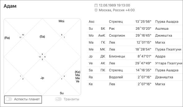 Также я рекомендую переключить указатель «Аспекты планет» в неактивный режим. Если не сделать этого, вы увидите в карте обилие разных обозначений, часть из которых написана серым цветом (лишних на данный момент). Когда отключите «Аспекты планет», эти серые обозначения исчезнут. Вам именно это и нужно.