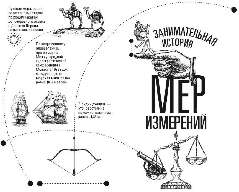 Выбор линейных мер мог быть связан с оружием, которое использовал человек. Так, в Индии дхануш – это расстояние между концами лука, равное 1,83 м. Персидская мера нейзе означает расстояние, которое пролетает копье, и приблизительно равняется 4–5 м, китайская мера инь – расстояние, которое пролетает стрела, выпущенная из лука, – 32 м, а норвежская мера бос-сескуд – расстояние, которое пролетает пуля, выпущенная из охотничьего ружья, – 62,75 м. Еще в XVIII веке морская лига означала дальность пушечного выстрела, которым мог быть обстрелян вражеский корабль, находящийся в прибрежных водах. Это расстояние было принято за ширину территориальных вод и составляло 5560 м.
