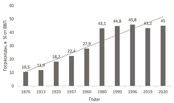 Рис. 1.1. Рост государственных расходов в среднем по странам, 1870–2020 гг., в % от ВВП15