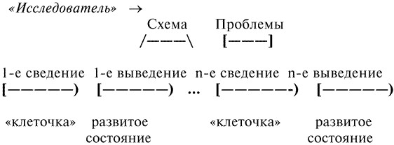 Процедура генетического сведения сменяется процедурой генетического выведения, и дальше они чередуются друг с другом, позволяя уточнить каждый этап анализа, таким образом эти процедуры образуют, как говорят в методологии, «челночный процесс». На схеме намеченная структура мыслительной работы выглядит так:
