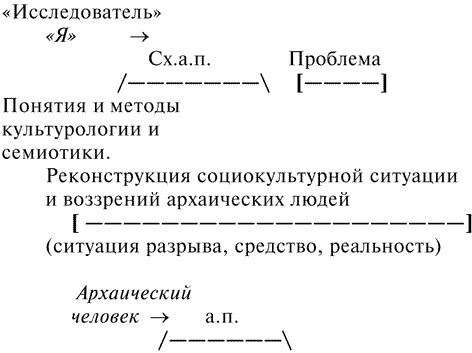 Итак, описав социокультурную ситуацию и возможные воззрения архаических людей, я объяснил, почему брачные отношения и любовь отождествлялись с охотой. Для этого мне пришлось реконструировать, во-первых, так называемую «ситуацию разрыва», сделавшую необходимым изобретение представления о душе, во-вторых, «средство», позволившее разрешить эту ситуацию разрыва (т. е. само архаическое понимание души), в-третьих, описать реальность, сложившуюся на основе данного средства. При этом необходимым условием адекватной реконструкции является использование целого ряда понятий – культуры, деятельности, знака и др. (см. [95; 102]). На схеме данный метод можно представить так:
