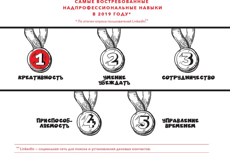 К тому моменту, когда ты начнёшь активно работать, так же как твои родители сегодня, принципиально важным конкурентным преимуществом в мире будет способность создавать идеи. Не в порыве вдохновения — когда снизойдет муза, а системно и предсказуемо, сродни выпеканию хлеба. В 2019 году LinkedIn поставил креативность на первое место среди надпрофессиональных компетенций, которые востребованы крупнейшими работодателями по всему миру. Это не удивительно, ведь компаниям всё больше нужны люди, которые будут создавать новые ценности и продукты в активно меняющемся мире.