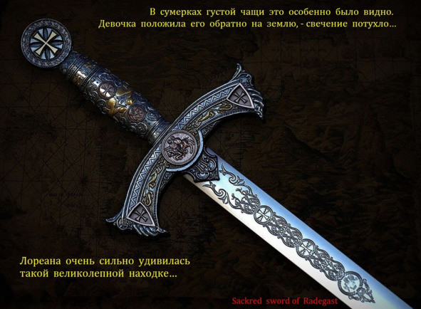 На его клинке красовались сплошные узоры и какие-то надписи. Рукоятка меча была украшена инкрустацией с красными и голубыми овальными камнями. С первого взгляда было видно, что меч сей — ручной работы, и стоить может очень дорого! Но Лореана о цене даже не думала, — она восторженно держала в руках подарок судьбы! Меч оказался на удивление лёгким. Но самое интересное и восхитительное для девочки заключалось вот в чём: как только она взяла его двумя руками и немного приподняла над землёй, клинок меча тут же засветился еле заметным голубоватым свечением! В сумерках густой чащи это было особенно видно. Девочка положила меч обратно на землю, — свечение потухло…