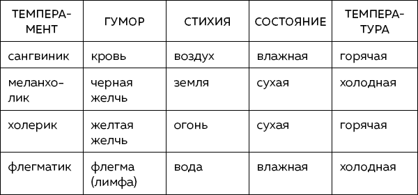 По сумме, состоящей из сока (гумора), элемента (стихии) и качества, включающего состояние и температуру, темпераменты выглядят следующим образом: