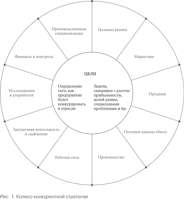 Рисунок 1, который может быть назван «Колесом конкурентной стратегии», служит в качестве средства наиболее сжатого отображения ключевых аспектов конкурентной стратегии фирмы. Осью колеса являются цели фирмы, то есть общее определение ее конкурентных намерений и конкретных экономических и неэкономических задач. Спицы колеса — ключевые направления деловой политики фирмы, с помощью которых она стремится реализовать свои цели. Под каждым пунктом схемы должно быть сформулировано краткое определение ключевых моментов деловой политики в соответствии со сферой производства и деятельности компании. В зависимости от характера бизнеса формулировки ключевых направлений деловой политики могут быть более или менее специфичны; будучи сформулированными, они составляют концепцию стратегии, которая может применяться в качестве руководства, определяющего все поведение фирмы. Как и в колесе, спицы (методы) должны исходить из центра (целей) и быть связанными друг с другом, иначе колесо не будет катиться.