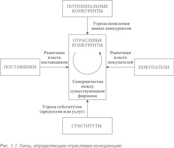 В качестве рабочего определения отрасли примем, что это — группа компаний, которые производят продукты, являющиеся близкими субститутами. На практике определение отрасли часто вызывает существенные разногласия, связанные с вопросом о степени взаимозамещаемости по параметрам продукта, процесса или географических границ рынка. Введя основополагающую методику структурного анализа, мы будем иметь возможность всесторонне рассматривать эти вопросы, поэтому для начала предположим, что границы отрасли уже определены.